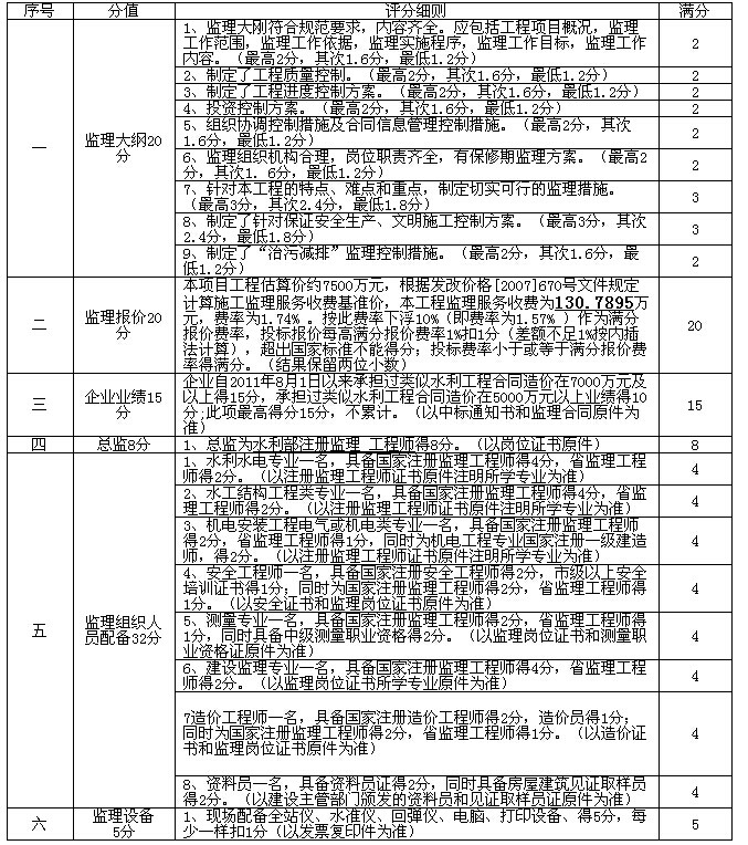 ④ 如有注冊(cè)證書處于延續(xù)注冊(cè)階段,以相關(guān)部門提供的證明原件為準(zhǔn)。監(jiān)理大綱為各評(píng)委獨(dú)立評(píng)分,無(wú)重大偏差,該項(xiàng)得分應(yīng)不少于60%,計(jì)分時(shí)取各評(píng)委評(píng)分中去掉一個(gè)最高分和一個(gè)最低分的平均值為該投標(biāo)人監(jiān)理大綱的最終得分(保留2位小數(shù))。