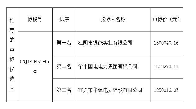 條子泥墾區(一期)條南片一至四區西片配套工程項目供電線路工程施工CNJ140451-07SG標段評標工作已經結束,現將中標候選人公示如下: