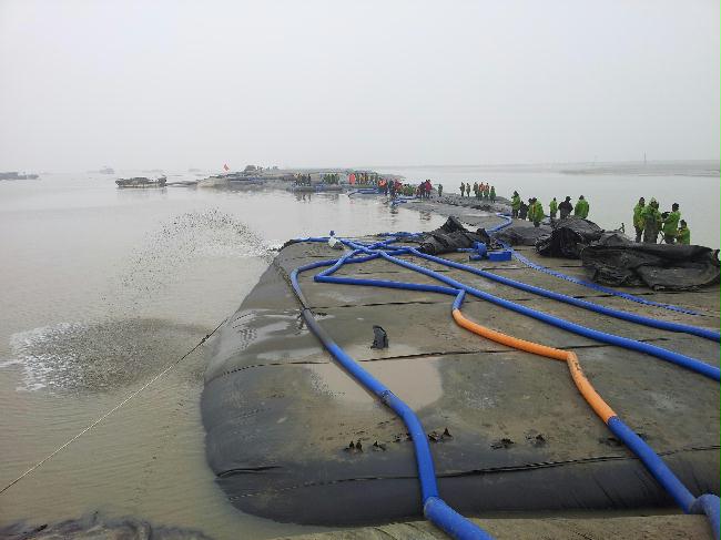 這次龍口截流工程在江蘇圍墾史上首次實現了三個互有影響的龍口同時截流,即3#隔堤龍口,東堤龍口和東堤倒塌深槽部位在同一個潮汛期內實現合龍。
