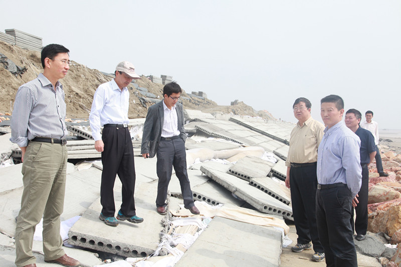 險情發生后,集團公司領導高度重視,在第一時間做出指示,要求立即開展搶險防護工程施工,全力護堤,避免損失進一步擴大,同時要采取一切必要的措施,保障所有施工人員的安全。受梁學忠董事長委托,陳才俊副總經理和投資發展處徐向紅處長于8日夜間趕到現場,并對現場搶險工作作了具體部署和安排。9日上午,梁學忠董事長、丁建奇總經理一行來到現場受災點,冒雨查看險情并指導下一步工作。梁學忠、丁建奇、陳才俊一行在東臺公司周金陽總經理等的陪同下,查看了東堤受損最嚴重的K8+400至K9+700段面。察勘了受損點的損失及搶險施工情況,向施工單位詢問了近期防汛工作安排,并與施工單位一起分析了險情發生的成因,查看了東堤外側港道擺動變化情況。