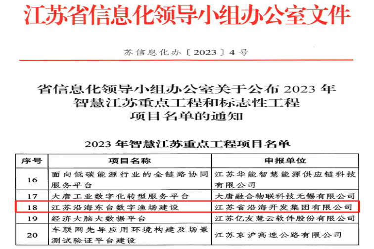 近日,江蘇省信息化領(lǐng)導(dǎo)小組辦公室公布了2023年智慧江蘇重點(diǎn)工程項(xiàng)目名單,江蘇省沿海開發(fā)集團(tuán)有限公司的“江蘇沿海東臺(tái)數(shù)字漁場(chǎng)建設(shè)”項(xiàng)目經(jīng)過初審?fù)扑]、形式審查、專家評(píng)審、綜合會(huì)審等環(huán)節(jié)成功入選,成為省級(jí)數(shù)字化示范工程的重要一員。
