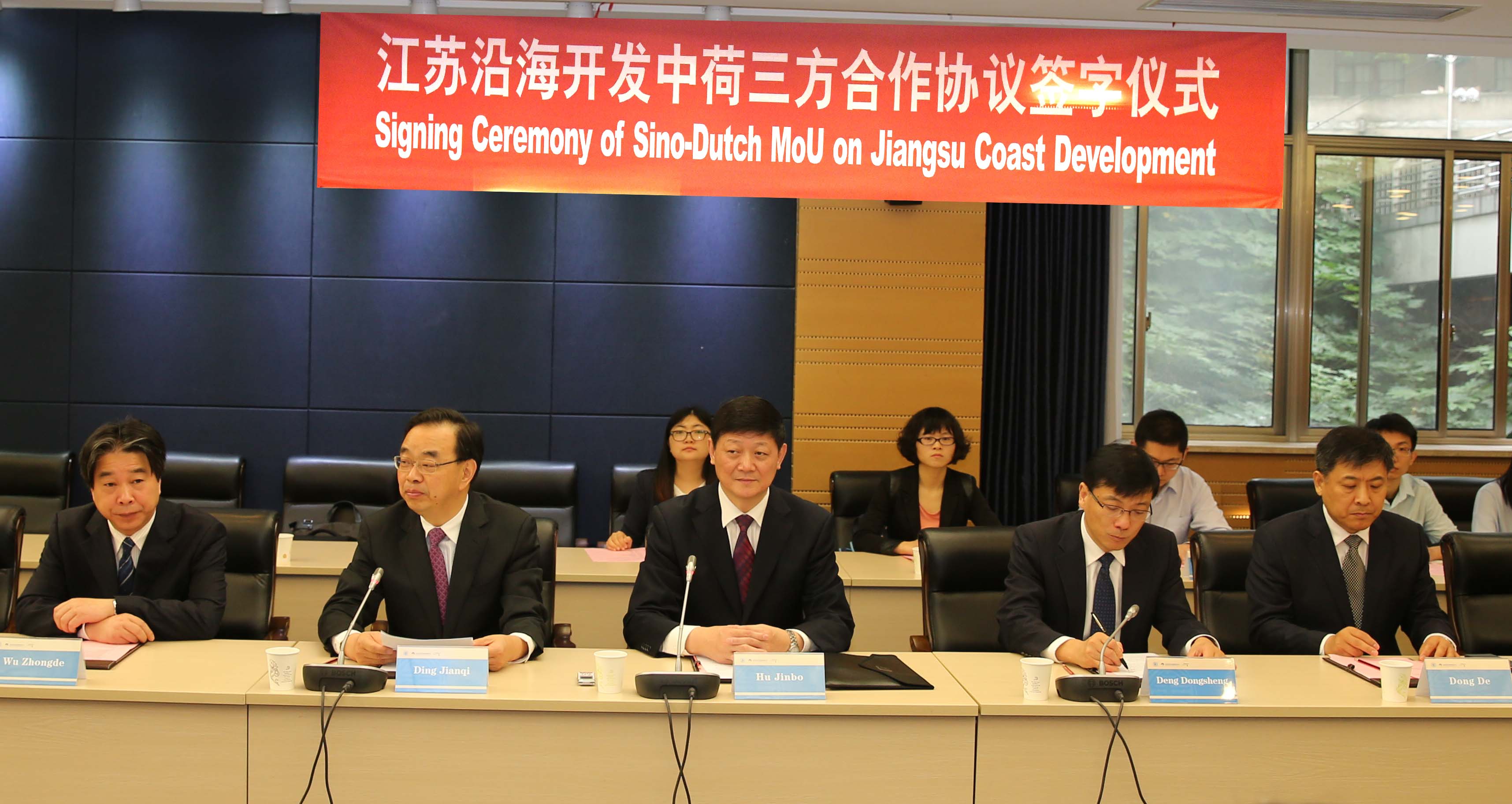 6月5日,江蘇省沿海開發集團、河海大學、荷蘭三角洲研究院在寧舉行江蘇沿海開發中荷三方合作協議簽字儀式及國際學術研討會。省委組織部副部長、省人才辦主任胡金波,荷蘭駐華大使館基礎設施和環境參贊 Anne te Velde(魏安娜)女士,集團公司董事長鄧東升,河海大學黨委書記朱拓教授,荷蘭三角洲研究院亞太區總監Tjitte Nauta(切特 納塔)教授,省委組織部干部四處處長董德,省外事辦公室國際交流中心主任吳忠德等領導專家出席儀式。集團公司總經理丁建奇主持儀式。
