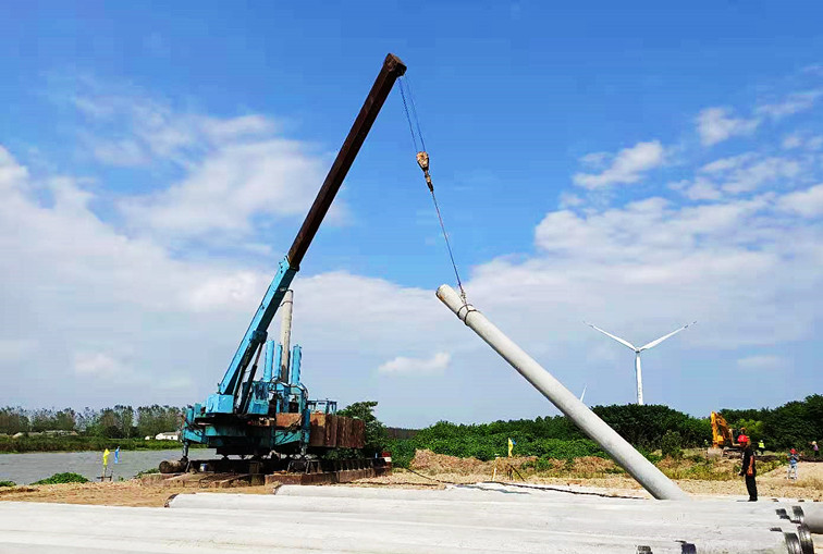 8月19日,大豐區三龍鎮龍南村斗龍港河南岸省沿海農發“糧食科技產業園”項目碼頭施工現場,二十多根PHC管樁整齊排列,一臺龐大的靜壓樁機穩坐河邊,伴隨著陣陣轟鳴,緩緩吊起10米長的管樁進行沉樁施工。不遠處兩個班組工人正頭頂烈日,加緊進行鋼筋預制、焊接作業。