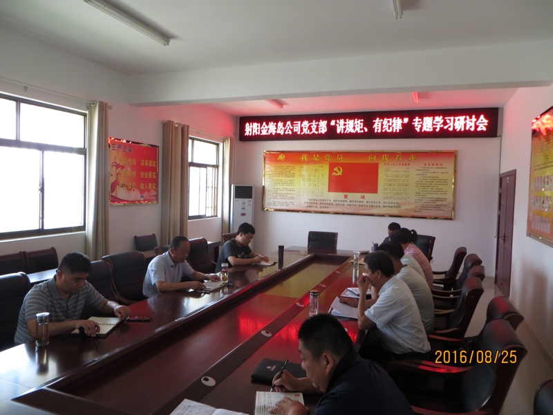 8月25日下午,金海島公司黨支部在辦公樓一樓會議室舉行了“講規(guī)矩,有紀律”專題學習研討會,支部書記薛太華同志主持了會議。會議首先組織大家集體學習了《中國共產(chǎn)黨章程(總則)》以及《習近平總書記系列重要講話讀本(實干才能夢想成真)》,之后,由陸中陽同志、王成同志以及王東同志就其最近的兩學一做學習情況,發(fā)表自己對“講規(guī)矩,有紀律”的感想。