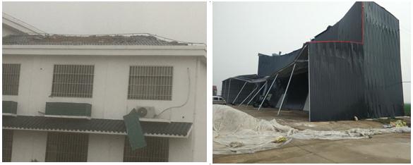 2017年7月15日凌晨1時許,射陽金海島公司突遭龍卷風和暴雨襲擊,最大風力達12級,雨量達160mm。受災區位于公司場部、雙洋片、千秋片和金港片,其辦公和生產生活用房、用電線路設備、糧食烘干設施、防風林樹木和田間作物均不同程度受損。據初步統計,受損房屋89間、電力線路250米、電桿2根、80KVA變壓器1臺、樹木165株、室外電子顯示屏1座及辦公樓生活水箱等。災害導致公司境內10多戶居民生活斷電、400多畝魚塘無電增氧投餌、3公里道路交通受阻、14000畝農作物受漬、300畝農作物沉澇,直接經濟損失達40多萬元,所幸沒有發生人員傷亡。