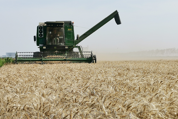金穗卷起千層浪,又是一年農忙時。放眼望去,聯(lián)合收割機來回穿梭于自營小麥田,一束束麥穗瞬間變成一顆顆飽滿的麥粒,隨風跳躍。農機逐浪,顆粒歸倉,倉東公司自營小麥喜獲豐收。