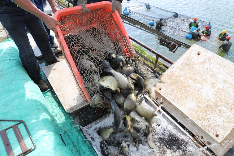 “工人們天剛亮就開始干活了,布網、投食、收網,取大留小”,農發金東臺分公司淡水養殖負責人王小祥介紹道。在他身后,工人們正在塘口將剛打撈上的魚過秤裝車,及時運往省內外市場。