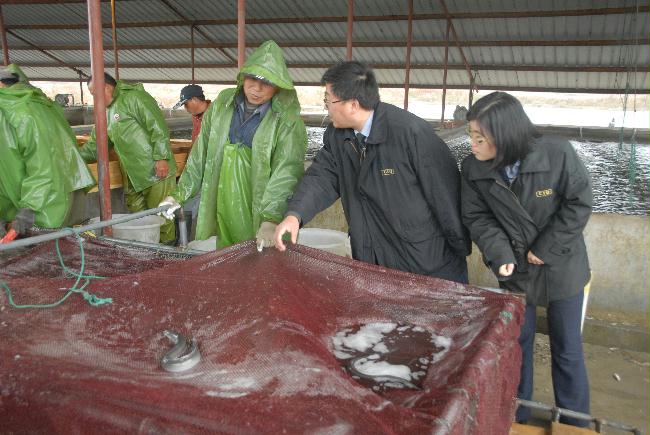 11月21日,鹽城市出入境檢驗(yàn)檢疫局檢查組到金東臺(tái)農(nóng)場檢查出口水產(chǎn)品質(zhì)量安全示范區(qū)日常監(jiān)管工作。檢查小組認(rèn)真聽取了質(zhì)量安全示范區(qū)建設(shè)領(lǐng)導(dǎo)小組副組長、金東臺(tái)農(nóng)場場長任之華的匯報(bào)。隨后,檢查小組仔細(xì)察看了日常監(jiān)管記錄,并冒雨親赴各塘口檢查,悉心詢問投入品使用情況以及具體的監(jiān)管措施,通報(bào)了國家對(duì)投入品最新的監(jiān)管要求,對(duì)個(gè)別細(xì)節(jié)問題提出了整改意見。最后,檢查小組對(duì)日常監(jiān)管整體工作表示滿意,并指出,示范區(qū)的監(jiān)管方式是行之有效的,通過規(guī)范、合理、嚴(yán)格的質(zhì)量安全監(jiān)管,示范區(qū)的放心農(nóng)產(chǎn)品大大豐富了居民的菜籃子。